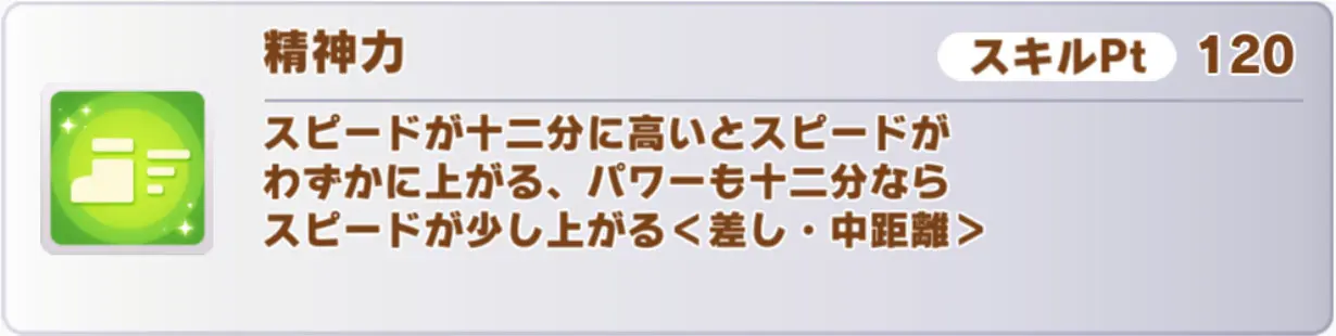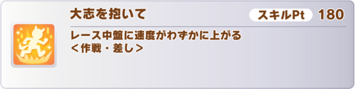 覚醒Lv2の「精神力」は、差し専用のスピード緑。覚醒Lv4の「大志を抱いて」は順位条件がない実用レベルの中盤速度スキル。