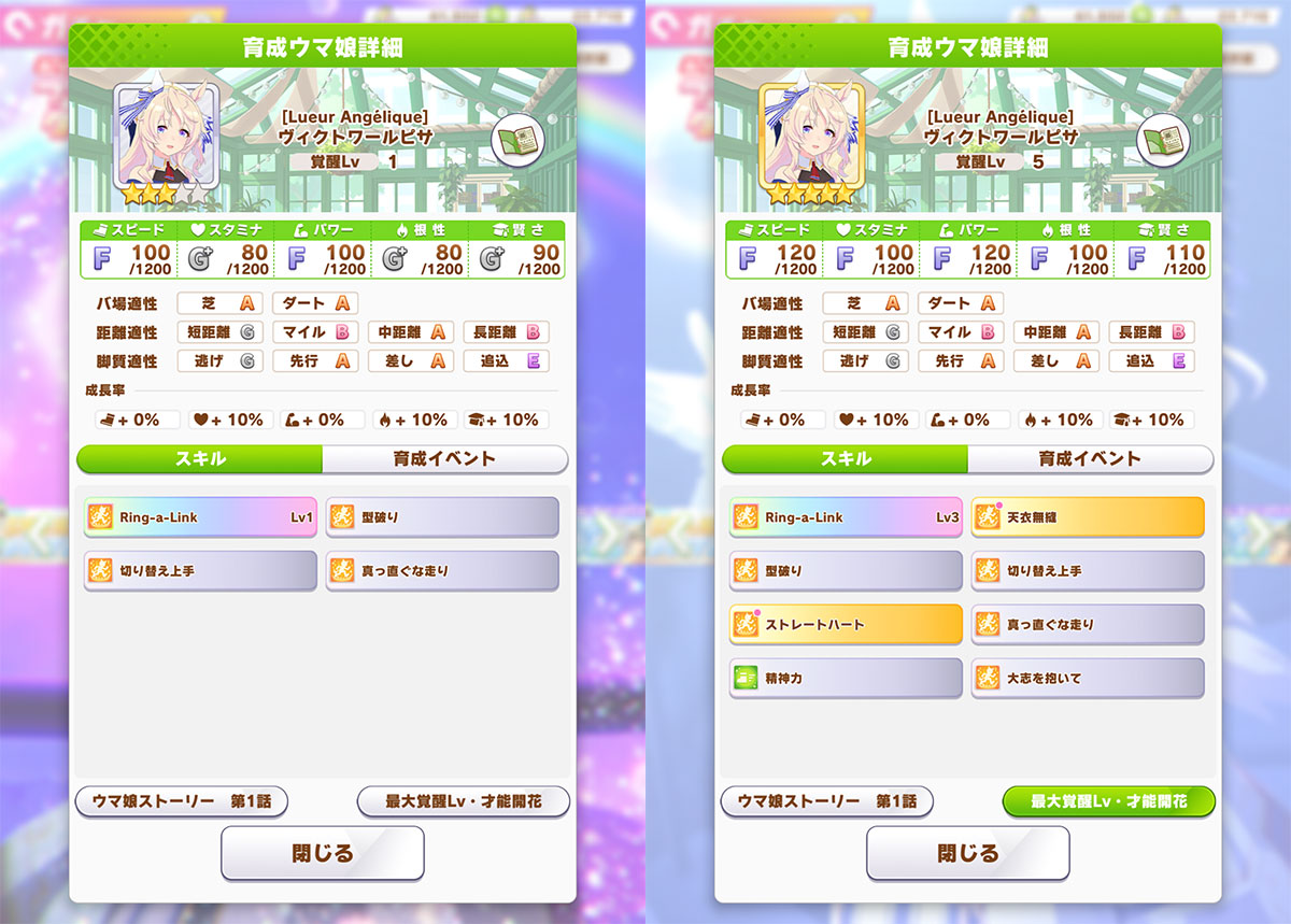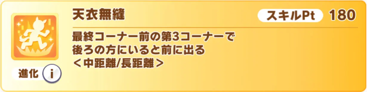 覚醒Lv5は第3コーナーで発動する現在速度スキル「天衣無縫」で、進化スキルは順位条件が消えつつ中距離限定の加速がついた「暗夜の灯」。