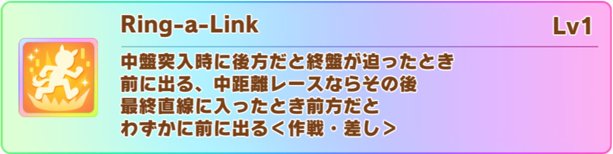 ヴィクトワールピサの固有スキル「Ring-a-Link」は、中距離特効の効果を持つ中盤後半速度スキルです。