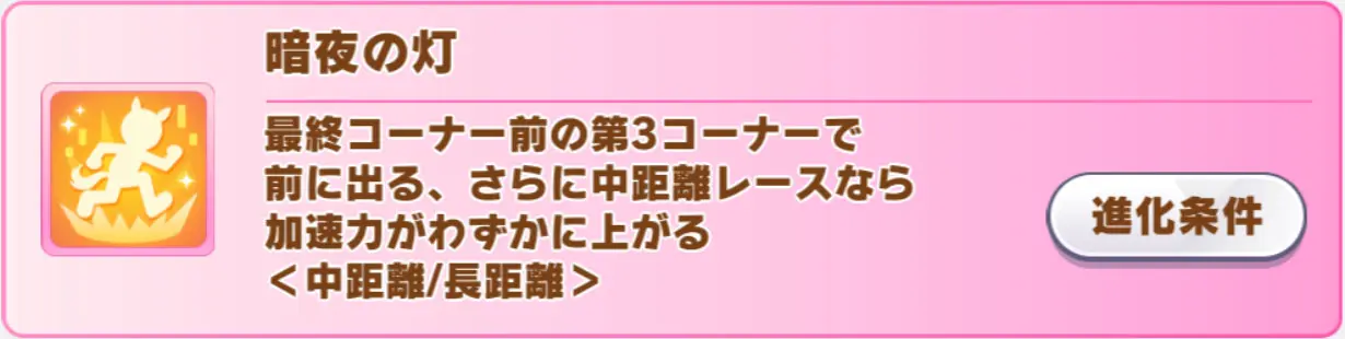 発動条件:最終コーナー前の第3コーナーのランダムな地点で、順位が上位50%以降(チャンミ:5~9位)(LoH:6~12位)<中距離/長距離>