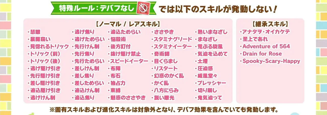 特に影響が大きいのが「スピードイーター」ですね。マイル最強の前方脚質向けスキルなので、これが使えないことで逃げがいつも以上に向かい風という環境。