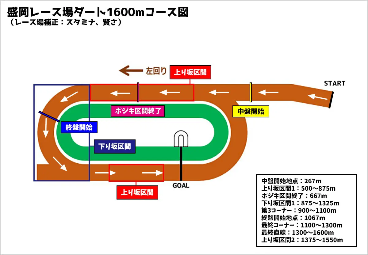 - 1 盛岡ダート1600mのコース図と重要スキル等の解説