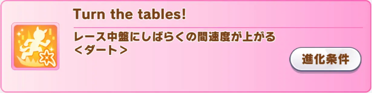 ダート逃げ最強と名高いこのキャラですが、とにかく固有の「Forward March!」が最高速度5500/5秒の中盤ものすごく速度効果で強力。出遅れると効果が落ちるんですが、出遅れ対策もコンセ進化「立ち位置ゼロ番!」で完璧です。
