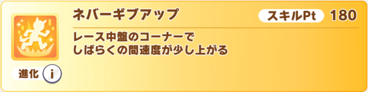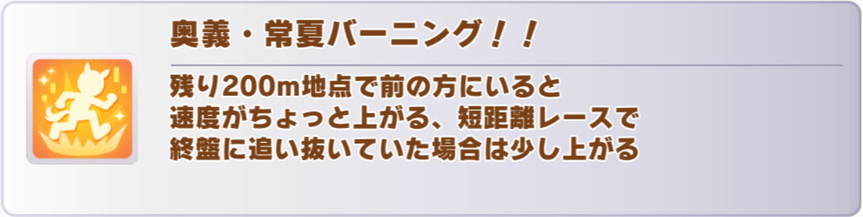 このキャラは固有スキル「奥義・常夏バーニング!!」のおかげで終盤力が非常に高い。さらに、進化スキル2種がいずれも終盤加速なのが、加速ゲーの短距離においては大きな強みとなります。
