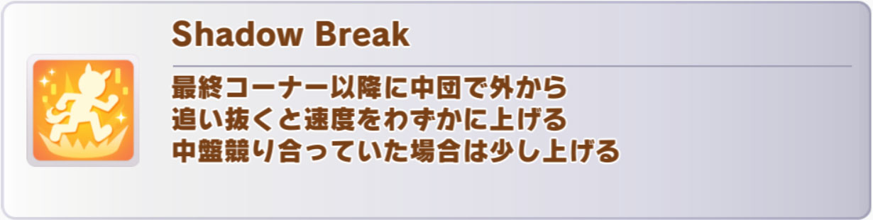 終盤固有以外では、「Shadow Break」(ナリタブライアン継承固有)あたりを採用するのもなしではないですね。発動タイミングがよければ終盤接続することもあります。