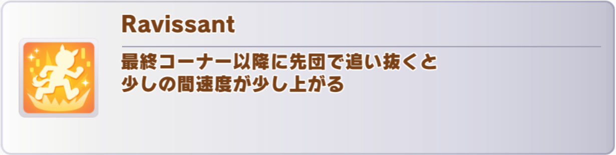 「Ravissant」(ダンスフジ継承固有)あたりも選択肢としてはアリ。1~4位発動で、追い抜きタイミングがよければ終盤接続します。