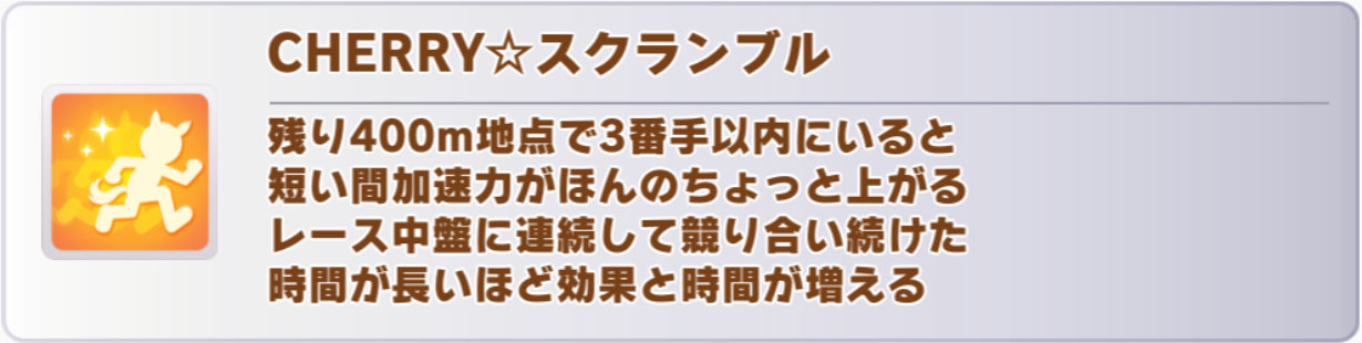 また、1~3位条件の「CHERRY☆スクランブル」(チアバクシン継承固有)も今回最速になるので、先行なら積むべきかと。
