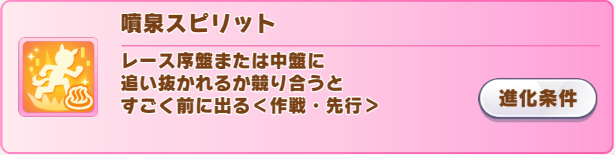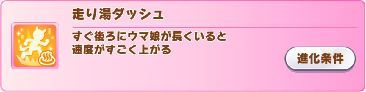 シナリオ進化スキルについては、「迸る気迫」進化の「噴泉スピリット」と、「お先に失礼っ!」進化の「走り湯ダッシュ」がおすすめです。