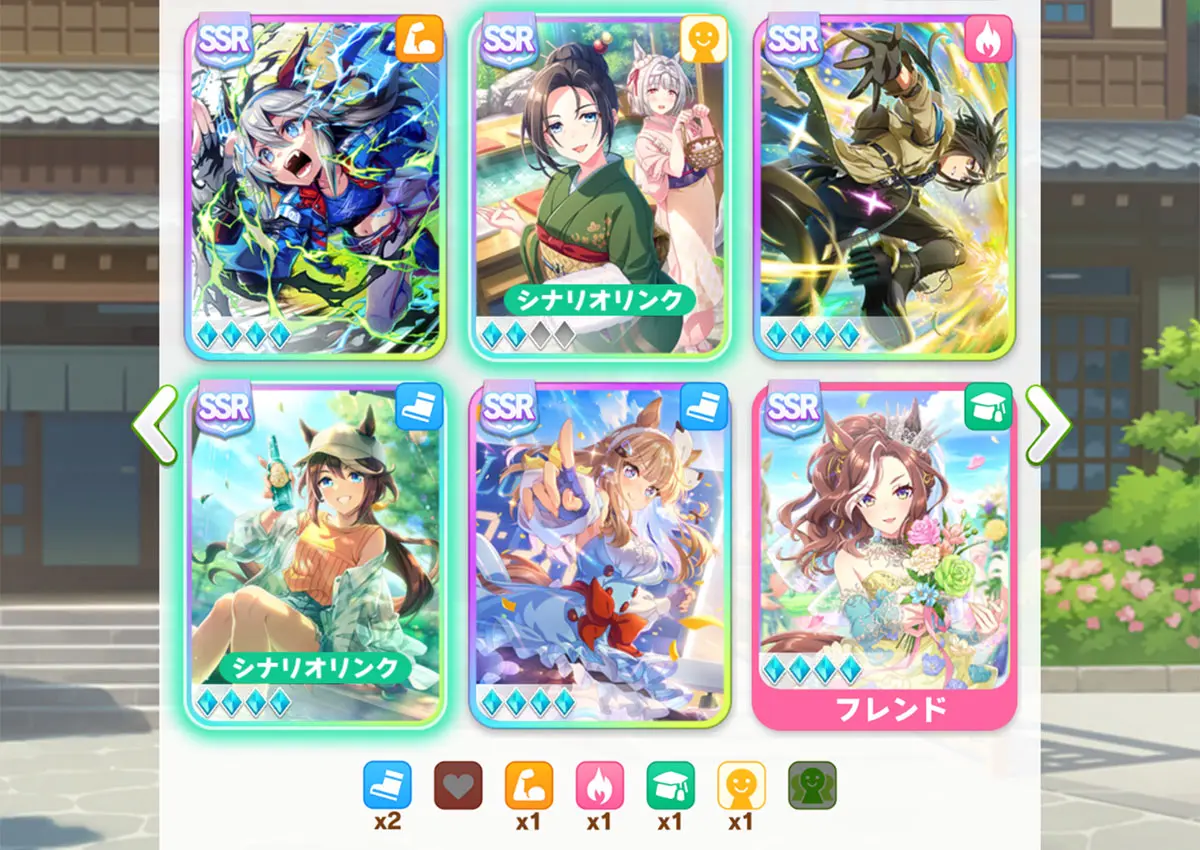 推奨サポート編成の型は、スピ2パワ1根性1賢さ1友人1となります。サポートの内容はともかくとして、タイプは今回これで固定することを強く推奨します。