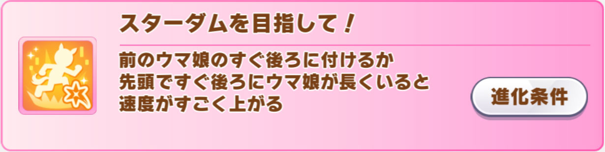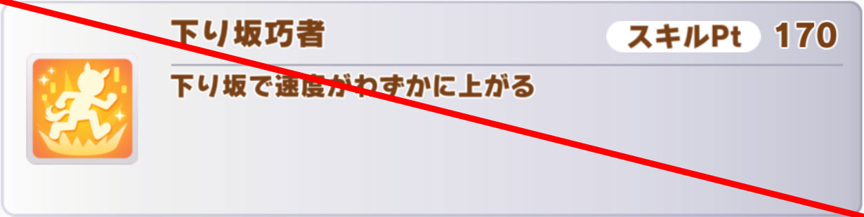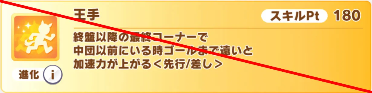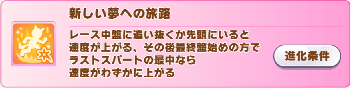 SSRトウカイテイオー(スピード)などから取れるんですが、キャラ固有の進化加速を除けば唯一の最速終盤加速なので、このスキルを取らないと今回のゲームの土俵に上がれません。これだけは絶対に取りましょう。