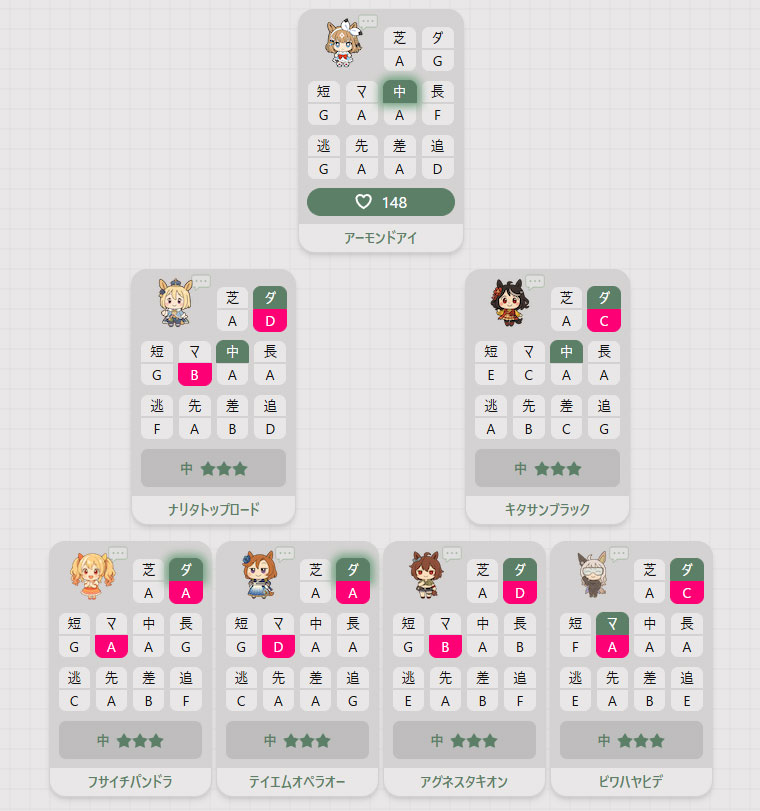 因子設計図の例がこんな感じですね。祖にするウマ娘がかぶっても良いかとは思います。祖や親の組み方に悩んでいる人は参考までに。