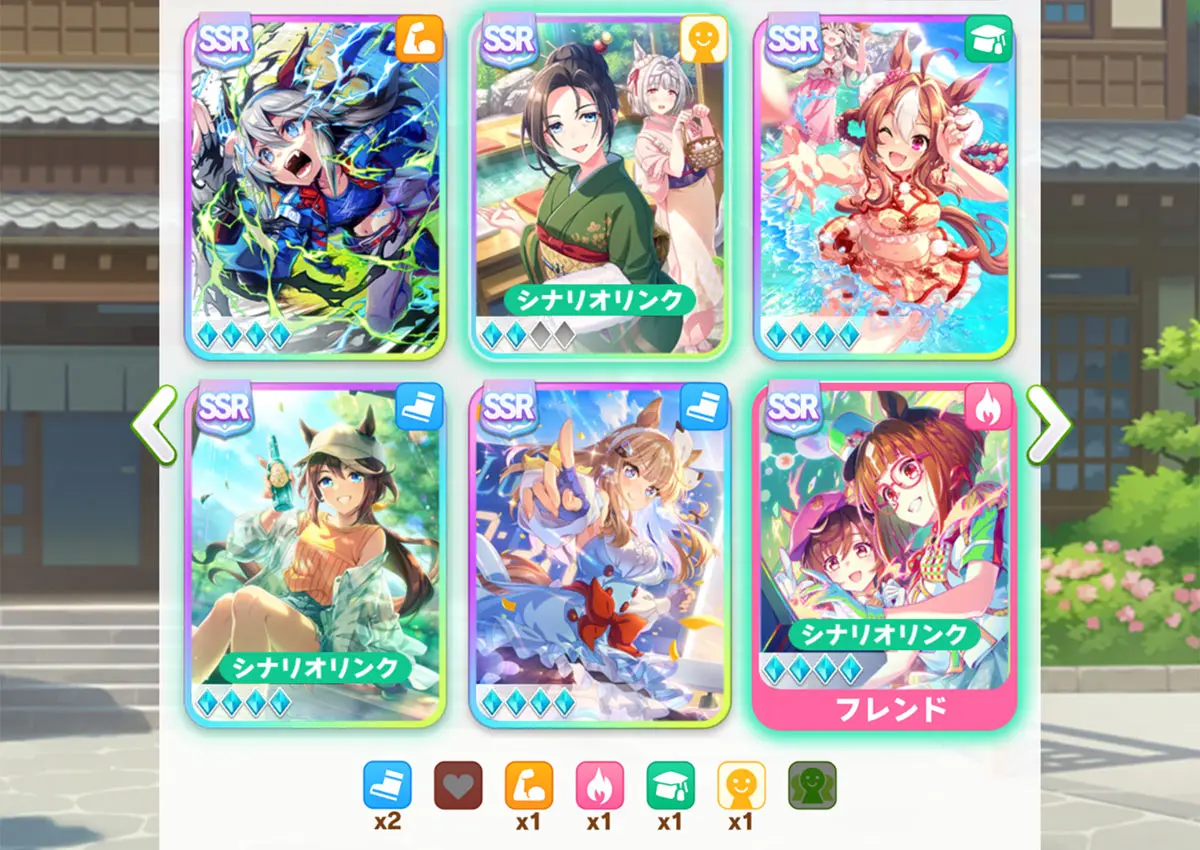 推奨サポート編成の型は、スピ2パワ1根性1賢さ1友人1ですね。先行についても、この形が無難かと。