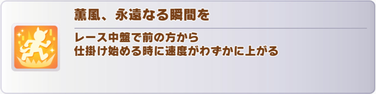 今回は追い越し困難区間(※)の前に発動するスキルの重要度が上がるため、「愛と熔けよただ熔けよ」(メジロラモーヌ継承固有)、「薫風、永遠なる瞬間を」(嫁グルーヴ継承固有)あたりはいつもより価値高め。