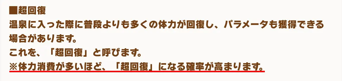 その「超回復」が発動する条件なんですけど、体力消費量が多いほど確率が上がると公式で発表されています。