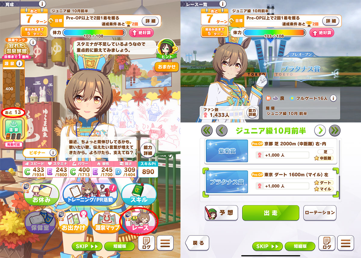 余談ですが、ジュニア級で堅忍の湯をあえてあまり掘らずに、レースに出てスキルPtを稼ぐという立ち回りもあるようです。その場合は、「疾駆の湯→明晰の湯→堅忍の湯(途中まで掘る)→天翔の古湯」のルートを通るんですが、堅忍を途中まで掘るタイミングで野良レースを活用する形ですね。サポートや因子が揃っていてスキルPtを稼ぎたいなら、こういった立ち回りを採用するのもアリでしょう。
