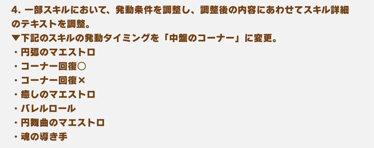 コーナー回復系のスキルの発動タイミングが変更となるようです。
