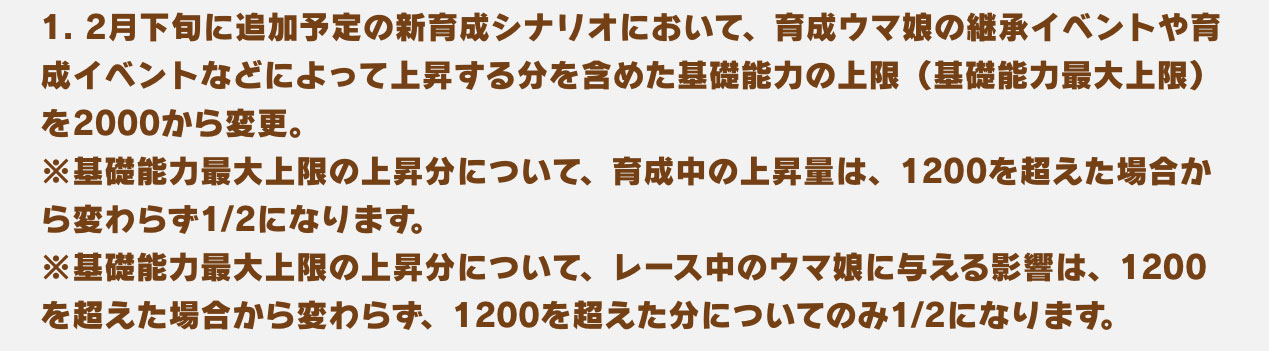 まず、スピード、スタミナなどの基礎能力の上限値が2000から変更になるようです。