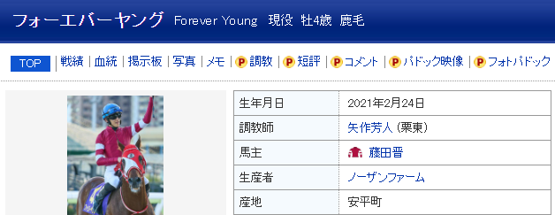 このフォーエバーヤングなんですが、生年月日が2021年2月24日で、これはゲーム「ウマ娘 プリティーダービー」のリリース日と同年同日です。