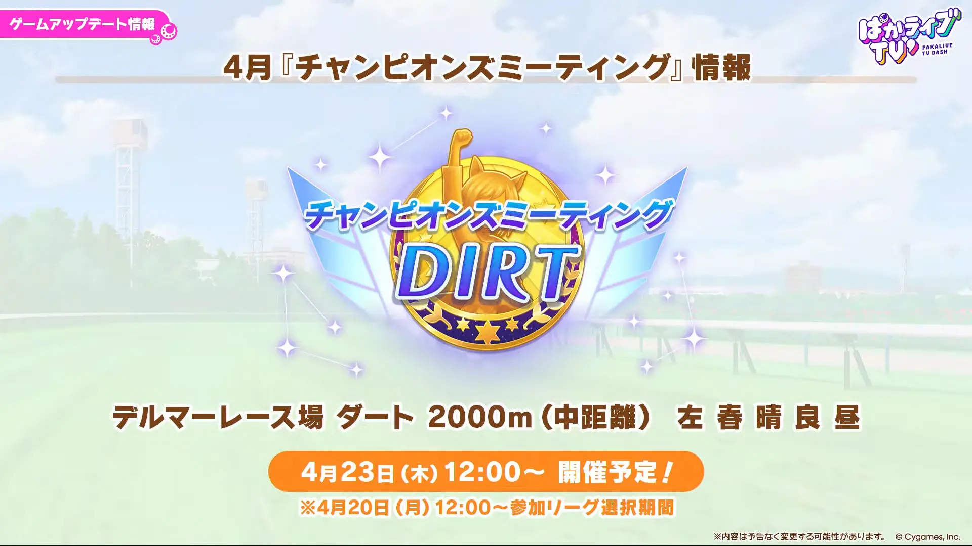 4月チャンピオンズミーティングDIRTは、4月23日から開催(デルマーダート2000m)